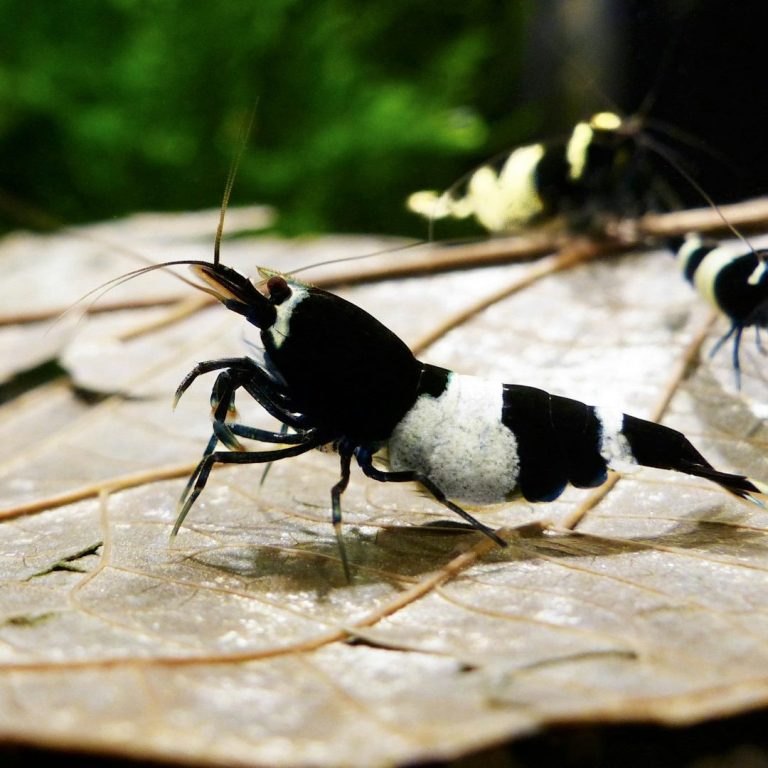 Black Crystal-garnalen (Caridina) met een zwart-wit kleurpatroon en actief gedrag. Ze kunnen zorgen voor een rustig maar contrastrijk beeld in een aquarium en vallen op door hun duidelijke tekening.