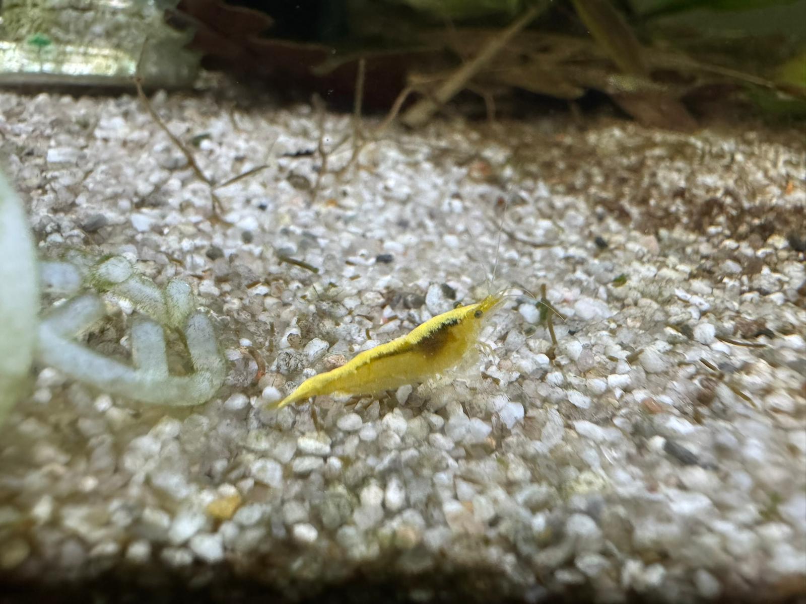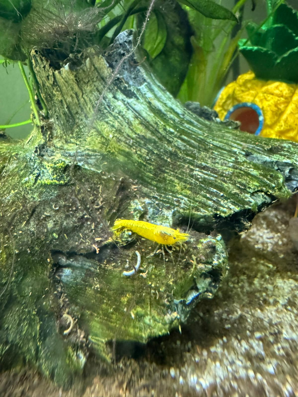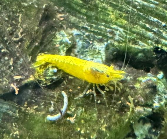 Gele Lemon-garnalen (Neocaridina) met een gele kleurtint en actief gedrag. Ze kunnen zorgen voor een frisse, lichte uitstraling in een zoetwateraquarium en vallen mooi op tussen planten en decoratie.